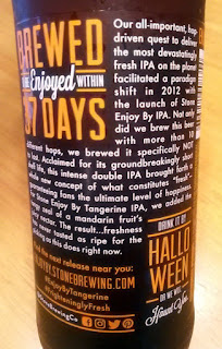What's on the Label: "Our all-important, hop-driven quest to deliver the most devastatingly fresh IPA on the planet facilitated a paradigm shift in 2012 with the launch of Stone Enjoy By IPA. Not only did we brew this beer with more than 10 different hops, we brewed it specifically NOT to last. Acclaimed for its groundbreakingly short shelf life, this intense double IPA brought forth a whole new concept of what constitutes "fresh" - guaranteeing fans the ultimate level of hoppiness. For Stone Enjoy By Tangerine IPA, we added the tangy zeal of a mandarin fruit's juicy nectar. The result...freshness has never tasted as ripe for the picking as this does right now."